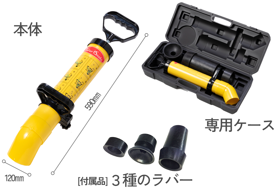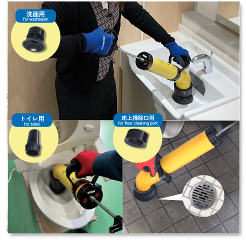 排水口にしっかりフィットする3種類の先端ラバー付きで、洗面、トイレ、床上掃除口など様々な場所で使えます。