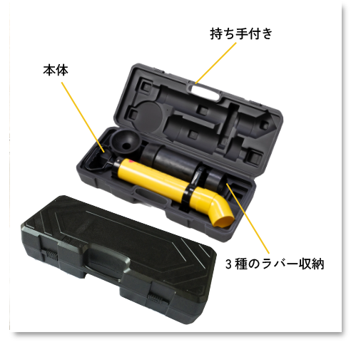 専用ケースに本体と3種のラバーが収納できるので清潔な保管が可能。持ち手付で持ち運びも楽々です。